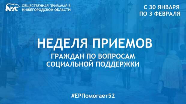 С 30 января по 3 февраля на площадках региональной и местных общественных приемных «Единой России» состоится тематическая Неделя приемов граждан по вопросам социальной поддержки. Традиционно в Неделе приемов примут участие депутаты всех уровней и партийный актив. К участию в тематических приемах граждан также приглашены представители Социального фонда России, Фонда обязательного медицинского страхования, Уполномоченный по правам ребенка и Уполномоченный по правам человека в Нижегородской области.