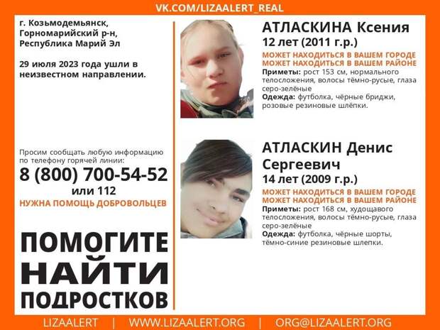 Ксению и Дениса Атласкиных из Республики Марий Эл разыскивают в Нижегородской области. Об этом сообщает поисковый отряд «ЛизаАлерт». 29 июля 2023 года брат с сестрой ушли в неизвестном направлении из Козьмодемьянска. С тех пор их местоположение неизвестно.
