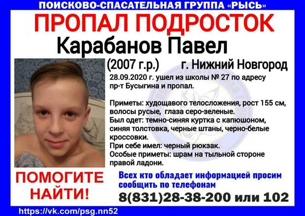 13-летний подросток пропал в Нижнем Новгороде. Павел Карабанов ушел из школы №27 на проспекте Бусыгина и перестал выходить на связь.