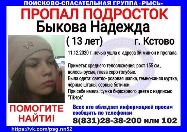 13-летняя Надя Быкова пропала в Кстове Нижегородской области. Об этом сообщают волонтеры поисково-спасательного центра «Рысь».
