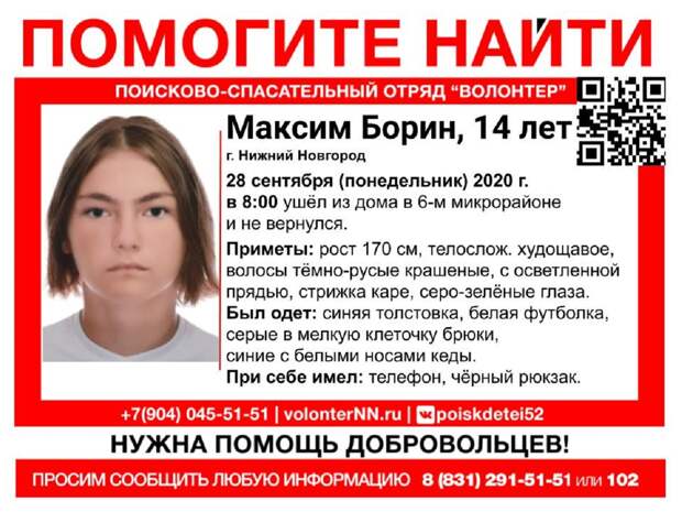 В Нижнем Новгороде пропал 14-летний Максим Борин. Подростка ищут уже больше суток.