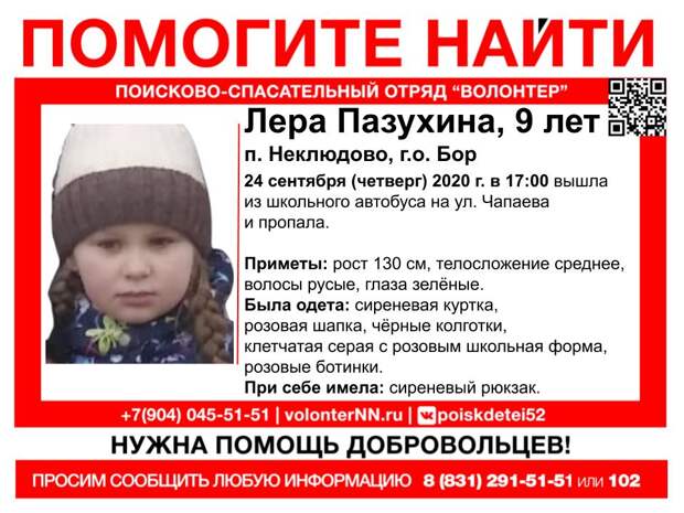 Как сообщает ПСО «Волонтер-НН», 24 сентября в 17:00 Лера вышла из школьного автобуса на улице Чапаева в поселке Неклюдово г.о.Бор и пропала.