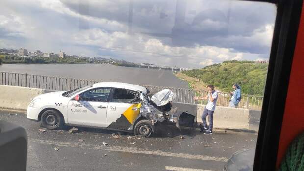 Машина Яндекс.такси и грузовик столкнулись на Молитовском мосту сегодня днем в Нижнем Новгороде.