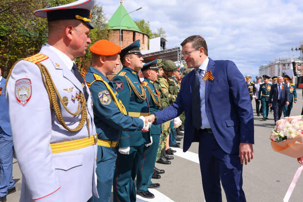 Губернатор Нижегородской области Глеб Никитин, присутствовавший на параде, поблагодарил командиров парадных расчетов. Глава региона отметил, что проведение парада на главной площади города — это историческая традиция. «В этом году Парад Победы вернулся на историческое место — площадь Минина и Пожарского. Именно от стен Нижегородского кремля в ноябре 1941 года уходили горьковчане прямо на фронт. Нынешний парад впервые в истории стал международным: по нашему приглашению в Нижний Новгород прибыли кадеты из Республики Беларусь, которые присоединились к прохождению парадных расчетов. Об этом мы договаривались с председателем правительства Республики Беларусь Романом Головченко в ходе моего визита в Минск. Очень рад, что все получилось и ребята смогли приехать», — рассказал Глеб Никитин. Всего в нижегородском параде участвовало более 55 кадетов Минского суворовского военного училища. Губернатор сообщил, что также впервые в параде приняли участие всадники казачьего конного клуба «Станица Вольная» на лошадях донской и орловской пород. Глеб Никитин добавил, что в рамках Дня Победы в Нижнем Новгороде запланирована масштабная вечерняя программа, которая включает в себя концерт «Хора Турецкого» и аудиовизуальное шоу в постановке Ильи Авербуха. «На здание Мининского университета будет транслироваться лазерная проекция портретов „Бессмертного полка“. Это будет самая большая в России „Стена памяти“. Завершится мероприятие праздничным салютом, который объединит всех нижегородцев и гостей в этот великий праздник. Спасибо огромное всем!» — сказал Глеб Никитин. Также при проведении парада на площади Минина и Пожарского присутствовали председатель Законодательного собрания Нижегородской области Евгений Люлин и глава Нижнего Новгорода Юрий Шалабаев. «Солдаты и офицеры Великой Отечественной войны покрыли себя неувядаемой славой. Нынешнее поколение военнослужащих приумножает ратные традиции дедов и прадедов. В парадном строю сегодня прошли защитники Отечества, готовые так же мужественно и смело сражаться с любым врагом, посягающим на наши рубежи и интересы. Мне хотелось бы поздравить с Днем Победы кадровых военных, добровольцев, мобилизованных, специалистов разных профессий, участвующих в специальной военной операции. Слова благодарности нужно сказать и работникам наших оборонных предприятий, благодаря которым в войска поступают обычные вооружения и новейшая перспективная техника. Мы обязательно преодолеем все трудности и победим всех врагов нашего Отечества!» — сказал Евгений Люлин. Как сообщил Юрий Шалабаев, вместе с кадровыми военными в параде принимали участие и воспитанники нижегородского военно-патриотического центра «Хочу стать десантником». «Они к этому долго готовились, репетировали. Для них участие в параде стало уже доброй традицией и почетной обязанностью. Многие ребята, побывав в лагере „Хочу стать десантником“, в дальнейшем выбирают для себя профессию военного. Парад сам по себе и празднование 9 Мая в целом — это часть патриотического воспитания. Детям здесь всегда интересно, они узнают больше об истории страны и города. Задача взрослых — подхватить волну детского любопытства и научить любви к Родине, уважению к нашей истории. Поздравляю всех с праздником — с Днем Победы!» — сказал Юрий Шалаб
