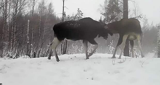 Год назад на месте этого поединка тоже засняли стычку лосей. Локация популярна у животных: по данным фотоловушек здесь одновременно пребывают до 5 лосей.