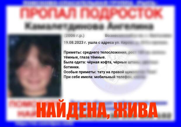 17-летняя девушка, пропавшая в Вознесенском районе, найдена живой. Об этом сообщили в поисково-спасательном центре «Рысь», объявившем о поисках в субботу, 19 августа. Волонтеры поблагодарили всех участников за оперативное реагирование. В поисковой операции участвовали сотрудники 8 отдела Управления уголовного розыска МВД России по Нижегородской области и МО МВД России «Дивеевский».
