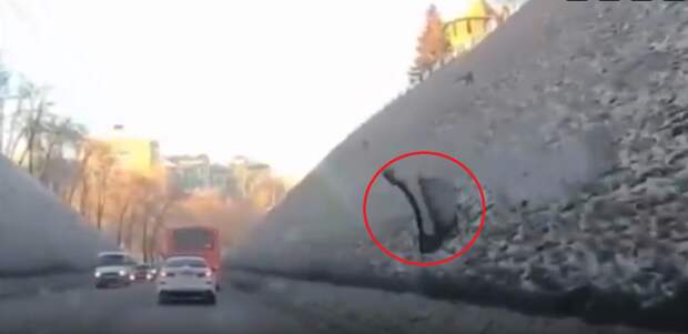 На склоне Зеленского съезда работал экскаватор, но внезапно у техники оторвался ковш и полетел вниз — прямо на проезжую часть. На видео видно, что автомобиль, из которого шла запись с видеорегистратора, не пострадал.