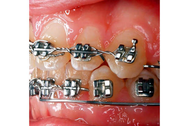 Несъемная конструкция – это дуги и брекеты. Выравнивание зубного ряда происходит за счет оказания давления от дуги на каждый брекет. Перед установкой требуется предварительная подготовка, если выявлен кариес, налет на зубах, воспалительные процессы и др.