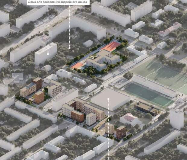 КРТ подразумевает расселение и снос 24 жилых домов. На их месте хотят возвести 15 зданий от 5 до 15 этажей и школу 1050 учеников. Также появится многоуровневая парковка открытого типа.