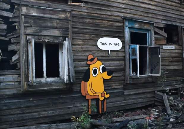 На сгоревшем доме на улице Нижегородской в Нижнем Новгороде появился арт-объект с собачкой. Фото с новым стрит-артом уличный художник Lev Kise опубликовал в соцсетях. «This is fire», – говорит собачка в шляпе, известная многим благодаря мемам. Героиня комикса, изображенная на сгоревшем здании, по закону жанра пытается убедить себя в том, что «все хорошо».