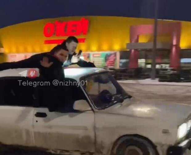 На кадрах видно, что один из пассажиров лежит на крыше, а второй — высовывается из окна. В момент съемок на парковке находились другие автомобили и пешеходы.