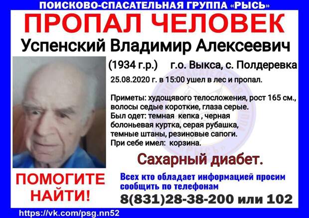 О пропаже Владимира Алексеевича сообщила поисково-спасательная группа «Рысь-Выкса». В селе Полдеревка дедушка пошел в лес за грибами и пропал.