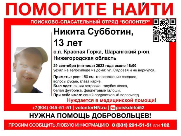 Если у вас есть какая-либо информация о местонахождении мальчика, волонтеры просят сообщить об этом на горячую линию отряда ПСО «Волонтер»: 8 (831) 291 – 51-51.