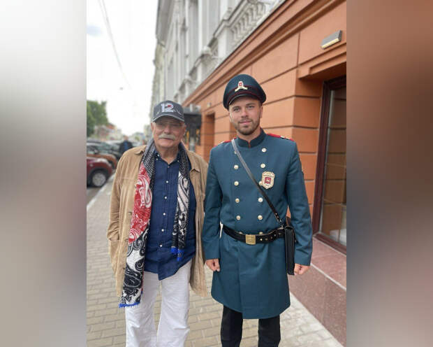 Никита Михалков прогулялся по улице Рождественской в Нижнем Новгороде с городовым. Фотография опубликована в группе «Новый городовой» ВКонтакте. Кинорежиссер приехал в город вместе с труппой Центра театра и кино со спектаклем «12» по одноимённому фильму в рамках программы «Большие гастроли». Посмотреть постановку можно 23 и 24 июня.