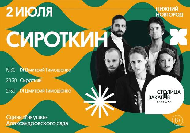 В субботу, 2 июля, на сцене «Ракушка» в Александровском саду выступит с концертом группа «Сироткин». Об этом сообщили представители «Центра 800» в соцсетях. В 19:30 публику разогреет DJ Дмитрий Тимошенко. Хедлайнер, инди-группа «Сироткин», выйдет на сцену в 20:30. Выступление группы будет длиться час.