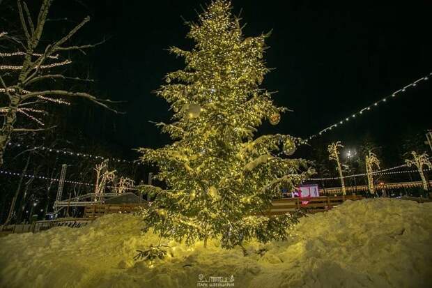 Запечатлеть себя на празднике можно на фоне инсталляций и фотозон парка – светового фонтана, золотых жёлудей, гигантской светящейся шишки, часов и станции новогоднего экспресса.