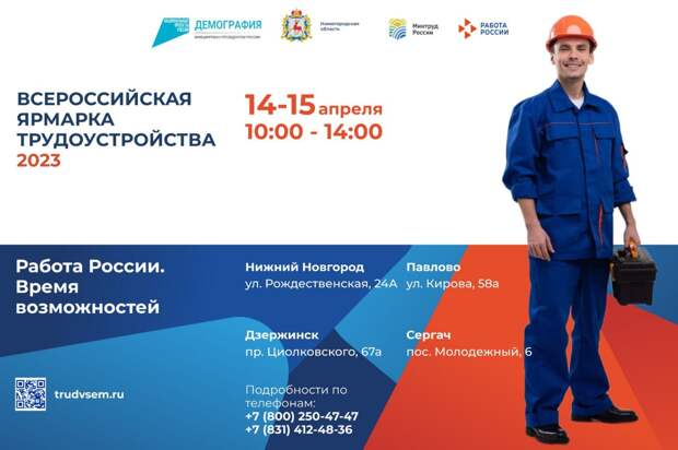 Сейчас открываются новые производства, активно развивается научное направление, поэтому потребность в кадрах очень высокая. Всероссийская ярмарка трудоустройства — хорошая возможность для тех, кто находится в поисках работы, чтобы познакомиться с работодателями, а для молодежи это шанс определиться с будущей профессией, выбрать нужную траекторию развития», — сказал губернатор Нижегородской области Глеб Никитин. На ярмарке будут представлены вакансии от 112 предприятий как для жителей региона с опытом работы, так и для выпускников учебных заведений или тех, кто еще не завершил обучение. Кроме того, будут представлены вакансии для людей с ограниченными возможностями. По информации службы занятости, средняя заработная плата на вакансиях для квалифицированных специалистов составит 70 тыс. рублей. Среди предприятий-участников ярмарки — АО «Выксунский металлургический завод», АО «Арзамасский приборостроительный завод им. Л. И. Пландина», ПАО «Газпром газораспределение Нижний Новгород», АО «Нижегородский завод 70-летия Победы», АО ФНПЦ «ННИИРТ», АО «Арзамасский машиностроительный завод», АО «НПО Правдинский радиозавод» и др. «Сейчас в нижегородской базе на портале „Работа России“ размещено более 55 тысяч вакансий. Каждое пятое предложение — вакансии в промышленности. При этом стабильно растет спрос на квалифицированных рабочих и инженеров. Те, кто сегодня находится в ситуации карьерного выбора, на ярмарке трудоустройства смогут лично пообщаться с ключевыми работодателями, уточнить условия труда и социальные гарантии», — рассказал руководитель управления по труду и занятости населения Нижегородской области Игорь Пантюхин. Среди вакансий, которые будут представлены на ярмарке, около 40% рассчитано на соискателей по инженерно-техническим специальностям и около 60% — по рабочим профессиям. Ярмарка трудоустройства будет проходить 14 и 15 апреля с 10.00 до 14.00 параллельно на четырех площадках: — в Нижнем Новгороде — на ул. Рождественской, 24А; — в Дзержинске — на пр. Циолковского, 67а; — в Павлове — на ул. Кирова, 58а; — в Сергаче — в пос. Молодежный, 6. Напомним, в рамках федерального проекта «Содействие занятости» нацпроекта «Демография» реализуется программа по модернизации службы занятости населения, призванная повысить эффективность работы организации. В 2022 году Нижегородская область стала участником первого этапа комплексной модернизации службы занятости. В регионе был создан единый центр занятости нового типа, объединяющий 16 филиалов и 38 отделений в каждом муниципальном образовании. Все центры занятости населения теперь работают в структуре нового учреждения под названием «Нижегородский центр занятости населения» и под брендом «Кадровый центр „Работа России“.