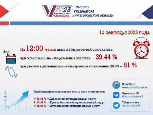 Лидерами по голосованию пока остаются Дивеевский район, где накануне побывал президент Владимир Путин, там свои голоса отдали почти 77 процентов избирателей. На втором месте Краснобаковский район с цифрами 73,5 процента, а «бронзу» взял Лукояновский район с результатом чуть больше 69 процентов. «Как мы можем видеть, процент явки достаточно высокий.