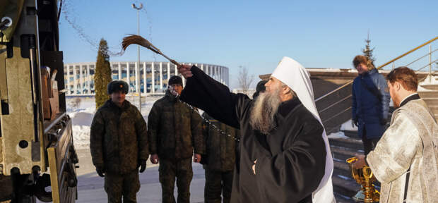 Правящий архиерей благословил отправляющихся на Донбасс, окропил святой водой солдат и груз.