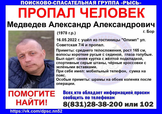 В Нижегородской области нашёлся Александр Медведев, которого спасатели искали на протяжении трех недель. 43-летий мужчина вышел из гостиницы на Бору и бесследно исчез. О пропаже мужчины поисково-спасательный центр «Рысь» сообщил еще 16 мая. Сообщалось, что он вышел из гостиницы «Олимп» на Бору, после чего его никто не видел.