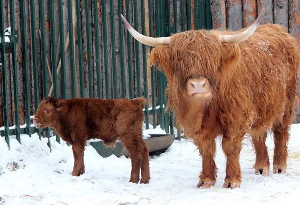 Малыш уже изучает окружающий мир, играет и скачет.Для того, чтобы маме и бычку было комфортно зимой в вольер установили специальную инфракрасную лампу. Она очищает воздух и дополнительно обогревает пространство. В ближайшие три месяца новорожденный будет питаться только маминым молоком. А маме малыша, Зорьке, после родов назначили специальную диету.