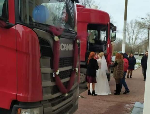 «На самокатах, велосипедах, мотоциклах, машинах в ЗАГС женихи и невесты приезжали. А вот на КАМАЗах первый раз!», — сообщают очевидцы.