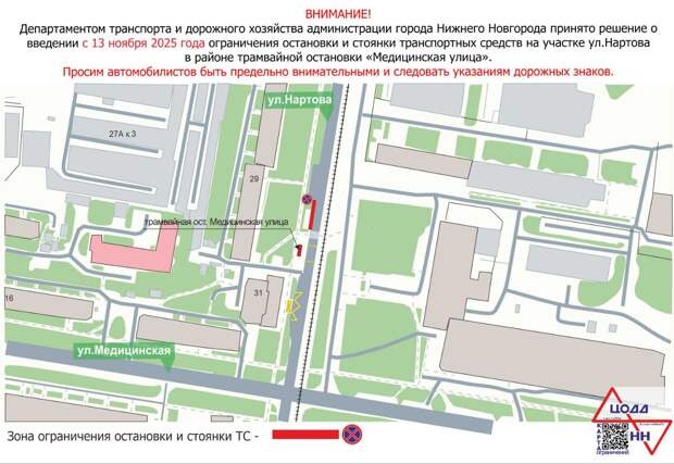 С 13 ноября 2025 года в Нижнем Новгороде будет ограничена остановка и стоянка транспортных средств на улице Нартова в районе трамвайной остановки «Медицинская улица».