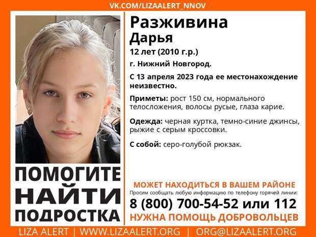 12-летняя девочка пропала в Нижнем Новгороде. Помощи в поисках Дарьи просит ГУ МВД России по Нижегородской области. Известно, что девочка ушла из дома по проспекте Ленина днем 13 апреля и не вернулась. Организованы поисковые мероприятия, привлечены добровольцы.