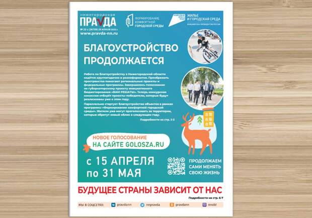 Вышел новый специальный выпуск газеты «Нижегородская правда». Главной темой номера стала программа «Формирование комфортной городской среды» (ФКГС), которая помогает благоустраивать общественные пространства региона. На первом развороте читатели найдут пошаговую инструкцию, которая поможет принять участие в рейтинговом голосовании и выбрать территорию, которую благоустроят в следующем году.