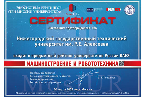 Нижегородский государственный технический университет вошел в число лидеров предметного рейтинга вузов России RAEX по семи направлениям подготовки – «Энергетика, энергетическое машиностроение и электротехника»; «Ядерные физика и технологии»; «Машиностроение и робототехника»; «Химические технологии»; «Технологии материалов»; «Нефтегазовое дело»; «Авиационная и ракетно-космическая техника», ‑занимая в них места в ТОП ‑20. Лучший показатель у НГТУ им. Р.Е. Алексеева в рейтинге по направлению подготовки «Ядерная физика и технологии», где у вуза 7 позиция.