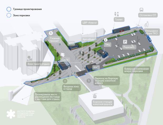 Концепцию благоустройства разработал Институт развития городской среды Нижегородской области в рамках инфраструктурной программы «Среда 800». Среди выявленных проблем территории — отсутствие понятной логистики и комфортных мест для отдыха, неудобства для пешеходов из-за организации планировки автомобильной парковки, недостаточный уровень существующего благоустройства и отсутствие функционального освещения.