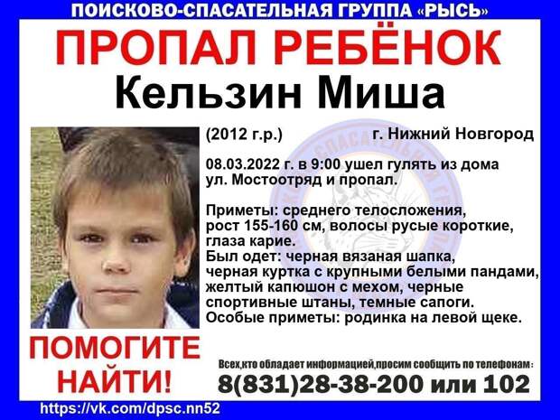 10-летний Миша Кельзин пропал в Нижнем Новгороде. Мальчик ушел гулять из дома по улице Мостоотряд 8 марта в 9 утра. Об этом сообщает ПСЦ «РЫСЬ».