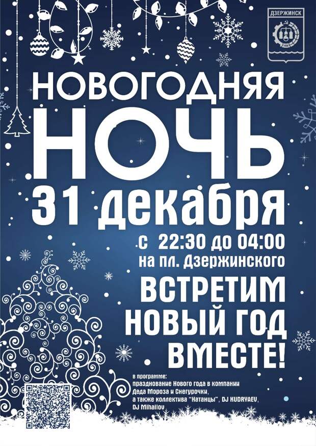 С 22:30 жителей города ждут поздравление Деда Мороза и Снегурочки, выступление группы «Натанцы», видеопоздравления Президента РФ Владимира Путина и губернатора Нижегородской области Глеба Никитина, личное поздравление от главы города Дзержинска Ивана Носкова и DJ-cет от самых крутых диджеев Дзержинска.