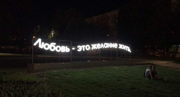 Одна из конструкций содержит надпись «М.Горький». Дизайном второй инсталляции стала цитата Максима Горького «Любовь — это желание жить».