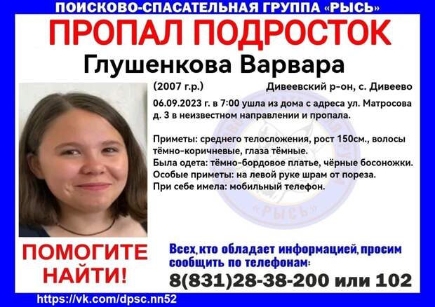16-летняя девушка ушла из дома и не вернулась в селе Дивеево. Волонтеры поисково-спасательного центра «Рысь» просят помочь с поиском. Варвара Глушенкова вышла из дома на улице Матросова, 3 в 7 утра 6 сентября. Подросток не вернулась до сих пор. На связь с близкими она не выходила.