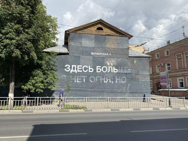 «Почти четверть века назад в доме №8 на улице Варварской произошел пожар, и с тех пор здание находится в аварийном состоянии. К счастью, за все это время не было принято решение о сносе, и здание 1820-х годов постройки сохранилось до наших дней. Оно вошло в перечень объектов культурного наследия, средства на реставрацию которых выделяет правительство России к 800-летию Нижнего Новгорода. Сейчас дом стал арт-объектом. Каждый, кто проезжает или проходит мимо, видит белые буквы: «Здесь боль…». Скоро эта часть нижегородской истории избавится от «боли», — отметил губернатор Нижегородской области.