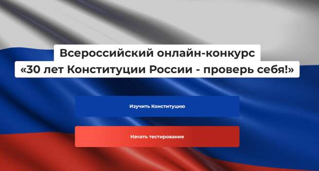 Конкурс «30 лет Конституции России — проверь себя!» проходит онлайн на сайте constitution.er.ru. Принять участие в нем могут все желающие старше 18 лет. «Участникам предстоит ответить на 10 вопросов об основах Конституции. Система выбирает вопросы случайным образом, они каждый раз разные. На прохождение теста дается 10 минут.