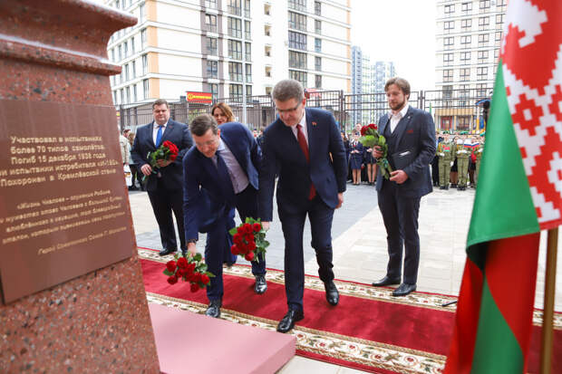 П. Чкалова Игорь Чкалов. «Очень важно, что мы открываем бюст Валерию Чкалову в сложный период, когда в некоторых странах объявили войну памятникам, войну истории. Мы же, наоборот, сохраняем память, укрепляем дружбу и замечательные добрососедские отношения, которые сейчас связывают Нижегородскую область и Республику Беларусь, города-побратимы Нижний Новгород и Минск», — сказал Глеб Никитин. Глава региона отметил, что бюст установлен на территории школы № 226, которая расположена на летном поле бывшего аэропорта «Минск‑1». «Особая гордость школы — музей гражданской авиации. Здесь собраны макеты летательных аппаратов, комплекты формы и экипировки летного состава, тематическая литература, авиационные приборы. В будущем году планируют открыть авиационный класс», — пояснил Глеб Никитин. Церемония открытия мемориала в Минске проходила в рамках проекта «30 дней до Победы» в преддверии одного из самых значимых праздников – 9 Мая. Участники мероприятия посетили экспозицию музея гражданской авиации. Глеб Никитин передал в дар школе сборник сочинений М. Горького и фотографию самолета Ту-160 «Валерий Чкалов». «Я надеюсь, личность Валерия Чкалова будет так же вдохновлять детей, учащихся в этой школе, как сам легендарный летчик вдохновлял миллионы ребят по всему Советскому Союзу в те времена, когда совершал свои подвиги», — добавил губернатор Нижегородской области. Глеб Никитин подчеркнул, что в 2024 году будет отмечаться 120-летие со дня рождения Валерия Чкалова, и пригласил представителей Республики Беларусь принять участие в торжественных мероприятиях.
