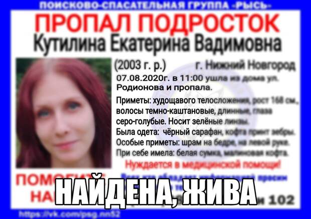 17-летнюю Екатерину Кутилину нашли живой. Девушка ушла из дома по улице Родионова 7 августа и пропала.