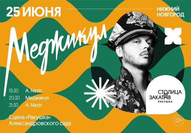 Завершиться субботняя программа «Столицы закатов» выступлением A.Nazin, которое начнется в 21:30.Группа Меджикул – музыкальная сенсация-революцией. Меджикул балансируют между несколькими актуальными стилями: NuDisco, Futurefunk, Neosoul. Их сложно определить к какому-либо направлению или жанру. Несмотря на футуристичность, их музыка напоминает ритм-н-блюзе 70‑х.
