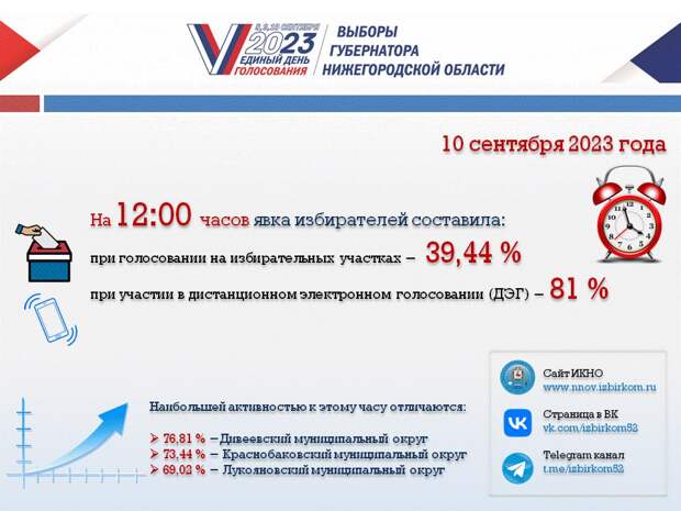 По состоянию на 12.00 10 сентября явка при голосовании на избирательных участках в Нижегородской области, по предварительным данным, составила 39,44%. Наиболее высокая явка избирателей на 12.00 наблюдается в Дивеевском (76,81%), Краснобаковском (73,44%), а также в Лукояновском (69,02%) муниципальных округах.