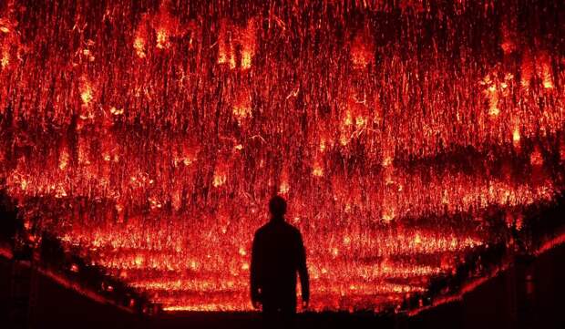 Следующим элементом экспозиции становится знаковая инсталляция ROW — десять вертикально подвешенных голографических дисплеев, преобразующих цифровые сигналы в аудиовизуальные образы с помощью алгоритмов.