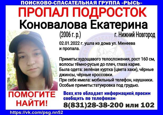 В Нижнем Новгороде пропала 15-летняя Екатерина Коновалова. Она ушла из дома по улице Минеева 2 января и не вернулась. Об этом сообщили в поисково-спасательном центре «Рысь».