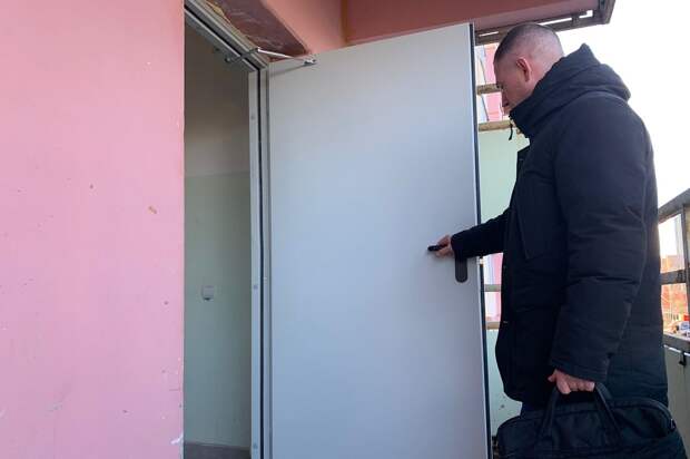 Коммунальная организация приводит в порядок технические двери, которые устанавливаются на эвакуационных балконах, в 17-тиэтажном многоквартирном доме на ул. Родионова в Нижнем Новгороде по требованию Государственной жилищной инспекции региона.