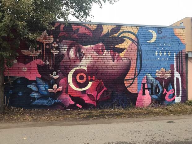 «Многие спрашивают: «Не автопортрет ли нарисовала Марина?» Она говорит, что нет. В работах художницы часто прослеживаются собирательные женские образы. По словам Марины, она рисует фей», — поделилась Лидия Кузнецова.Совместный проект Александра Dyoma и Василия Lst украсил улицу Карла Маркса. Художники создали два мурала под названием «Прятки» на фасадах соседних домов. На одном их них изображены дети, которые играют в прятки с ребятами, нарисованными на другом доме.
