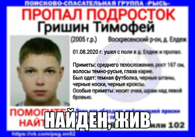 15-летнего Тимофея Гришина из деревни Елдеж Воскресенского района нашли живым.