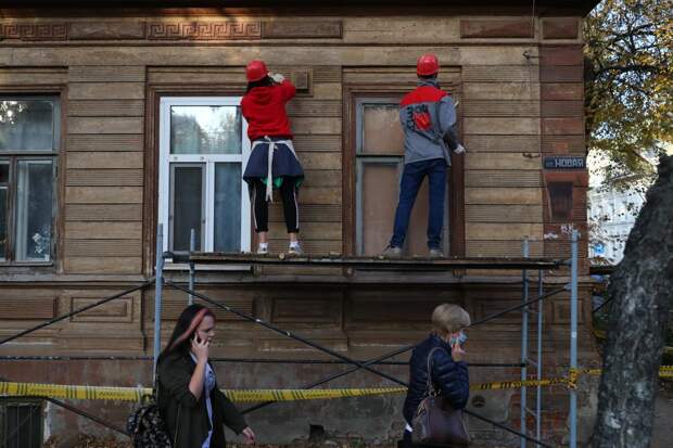 Активисты фестиваля «Том Сойер Фест» приступили к очистке от старой краски фасада главного дома усадьбы Лемке в квартале Трех Святителей.